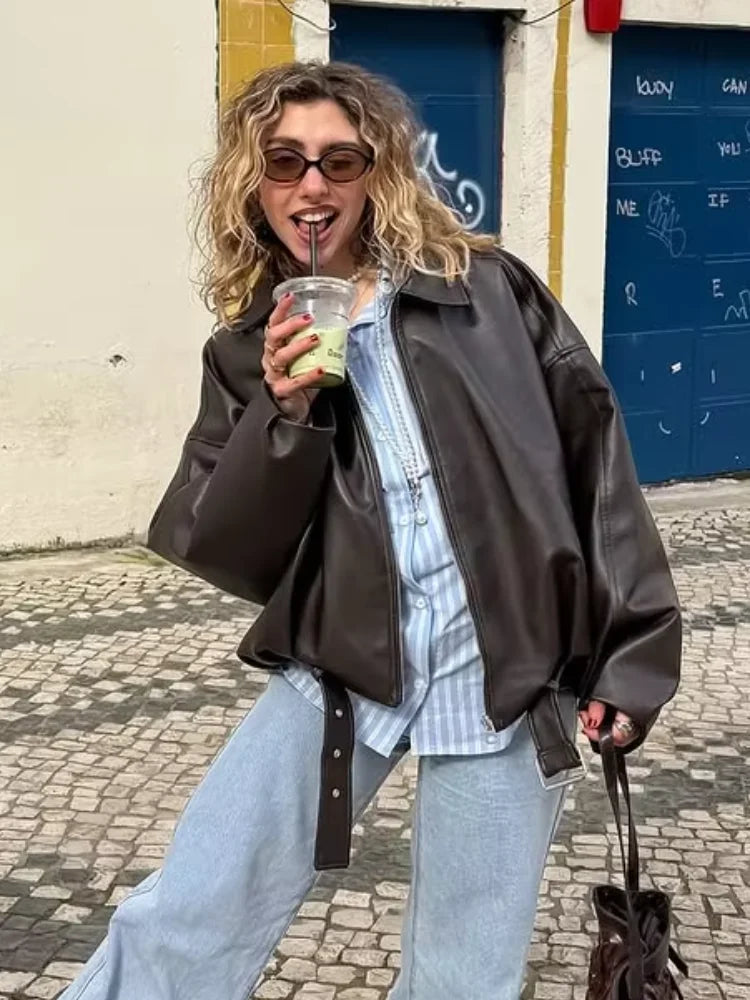 Casual Lapel Zipper Waist Belt Short Leather Jacket 2026 Women Loose Solid Pocket Pu Coat Autumn Lady Daily Highstreet Jackets