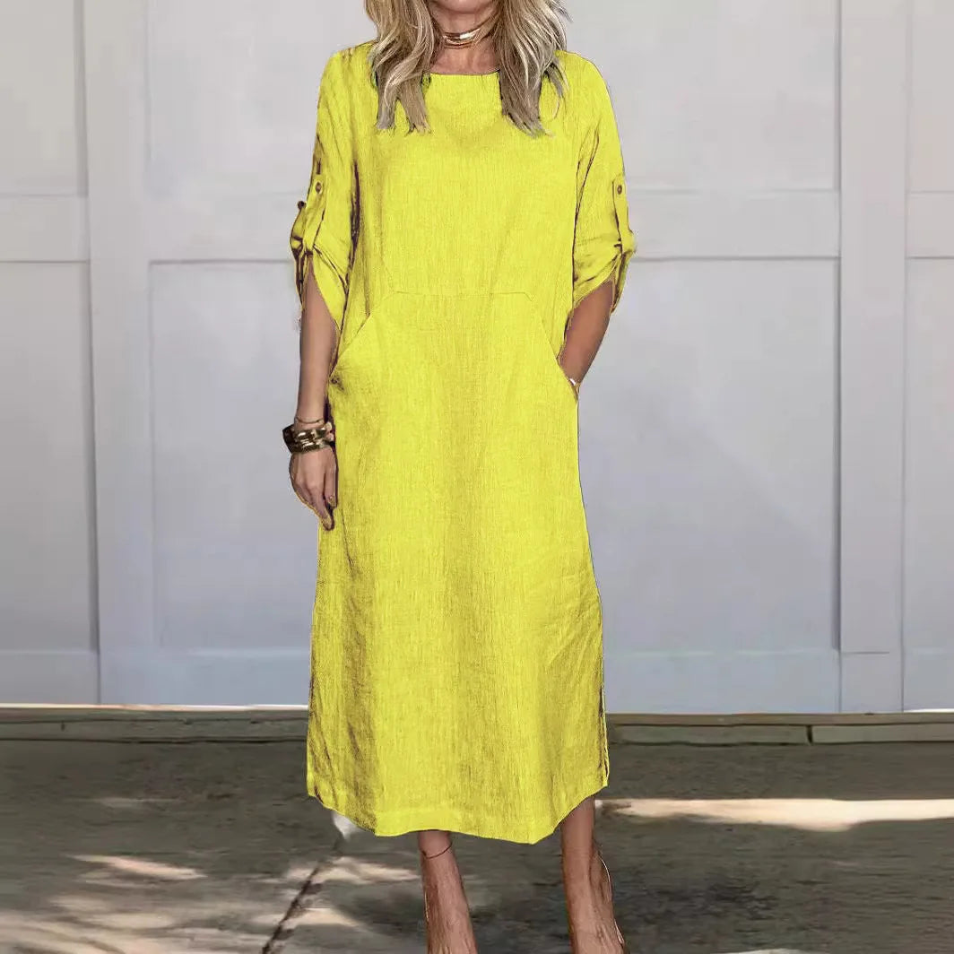 Cotton Linen Dress For Women 2026 Summer Loose Casual Solid Color Short-sleeved Pockets Long Dresses Elegant Women's Clothing