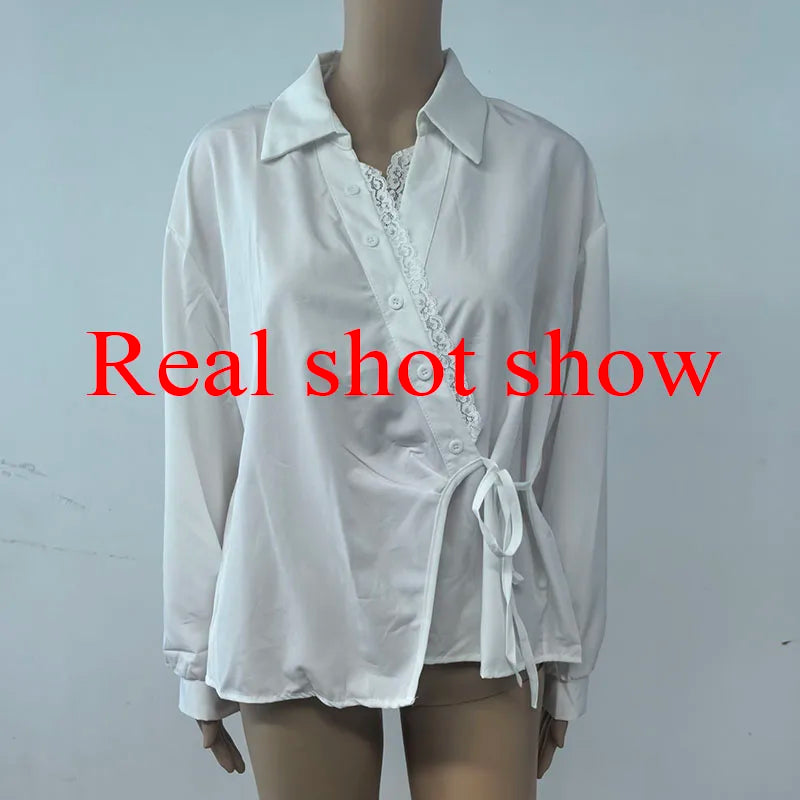 French Retro Lace Patchwork V-Neck Shirts Women Fashion Irregular Bandage Long Sleeve Shirt Woman Korean Design White Blouse