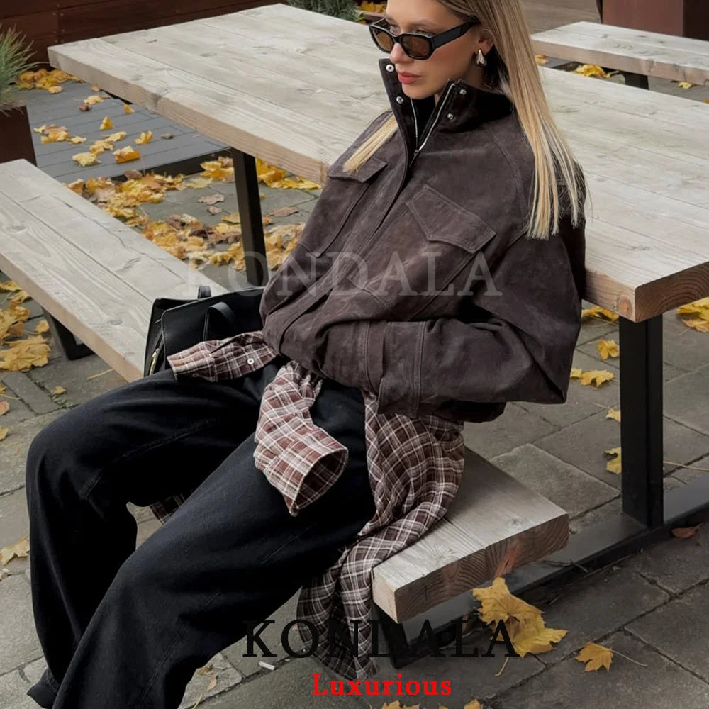 KONDALA Chic Suede Women Bomber Jacket Women Long Sleeve Pockets Straight Loose Coat Fashion 2025 Fall Winter Streetwear Outwear