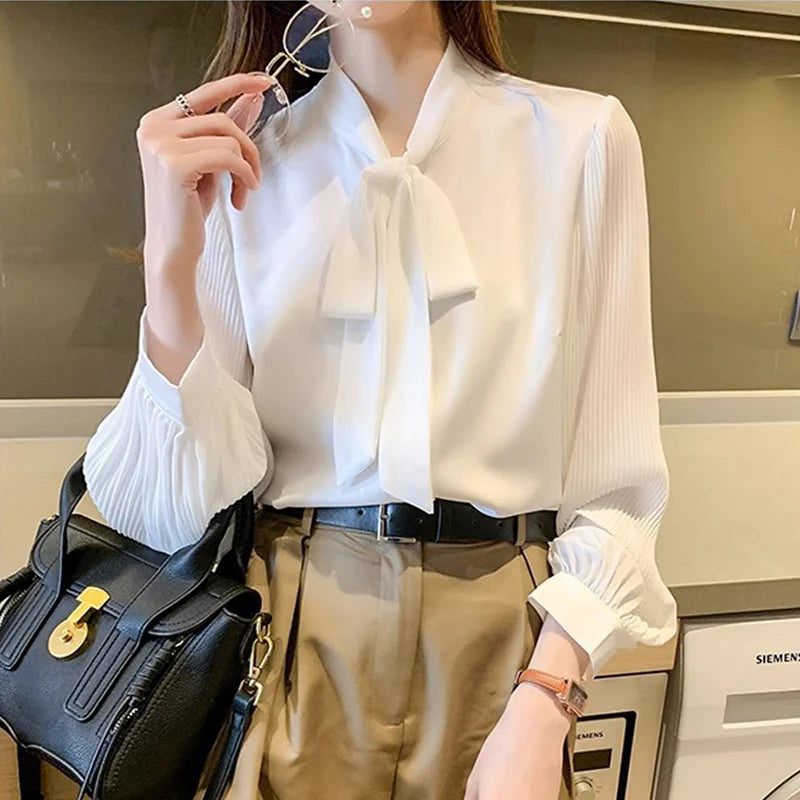 New Pleated Sleeve Chiffon Blouse Women Spring Summer Chic Design Bowknot Lace-Up Long Sleeve Shirt Simple Professional Clothing