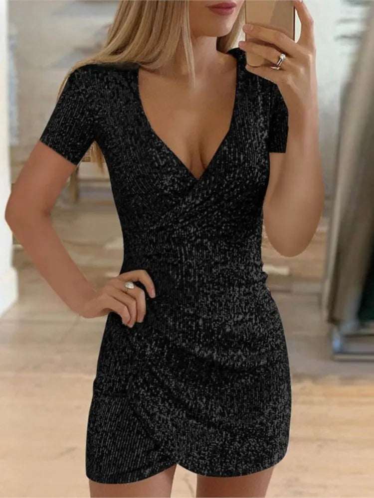 Sexy V-neck Package Hip Irregular Dress For Women Fashion Sequin Shiny Short-sleeve Mini Dress Elegant Party Dresses Female