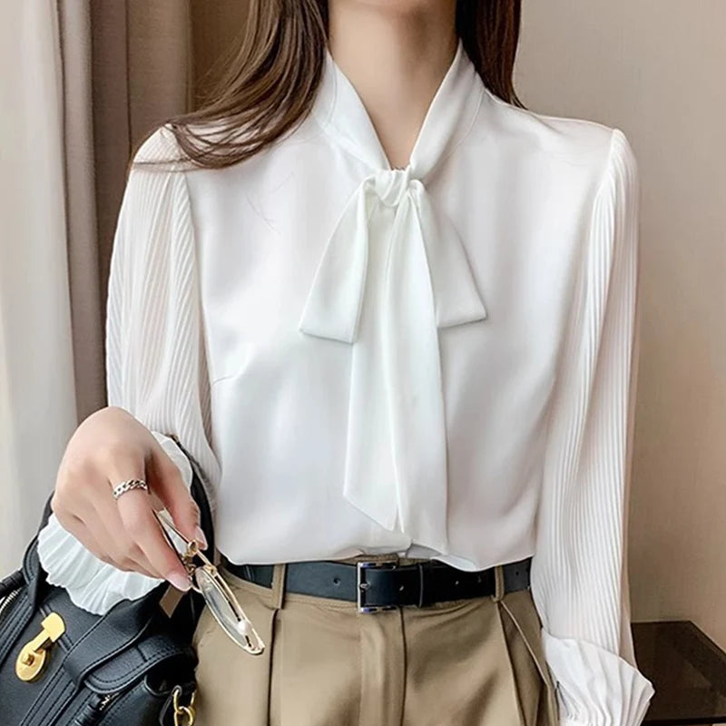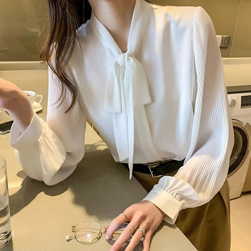 New Pleated Sleeve Chiffon Blouse Women Spring Summer Chic Design Bowknot Lace-Up Long Sleeve Shirt Simple Professional Clothing